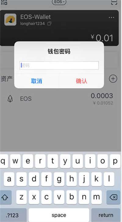 2:然后我们在弹出的界面中,输入钱包的密码进行更新EOS账户,然后点击确定进入更新公钥的界面;