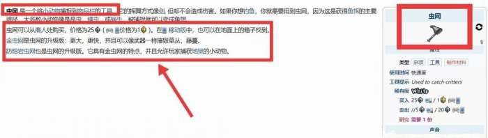 在游戏《泰拉瑞亚》中,虫网是一个将小动物捕捉到物品栏的工具,排行为虫网、金虫网、防熔岩虫网。虫网可以从商人处购买,价格为1金币也可以在地面上的箱子找到。金虫网是虫网的升级版,更大,更快,并且可以像武器一样摧毁草丛,藤蔓。防熔岩虫网也是虫网的升级版。它具有金虫网的特点,并且允许玩家捕获地狱的小动物。