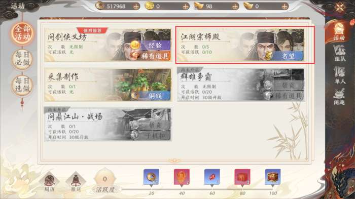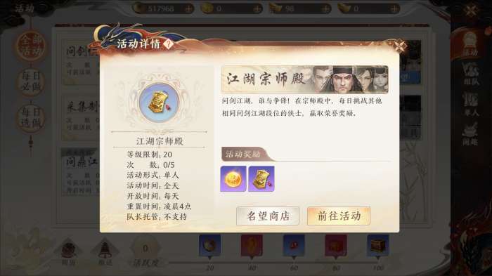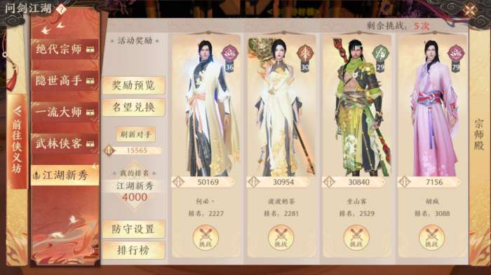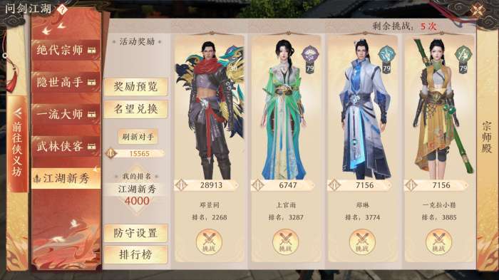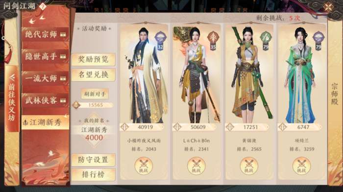 少侠可在「江湖宗师殿」中,挑战同处一个江湖榜的其他侠士(无需侠士在线)。