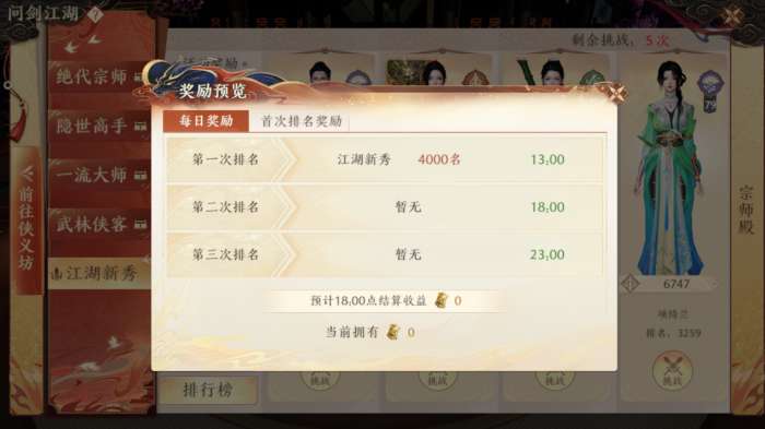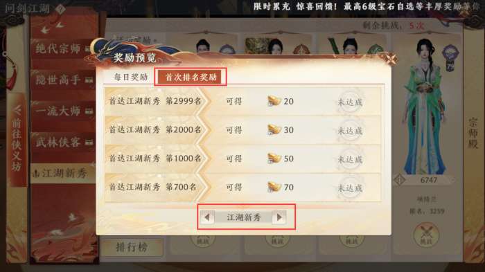 在「江湖宗师殿」中,排名奖励包括两种:每日奖励与首次排名奖励。