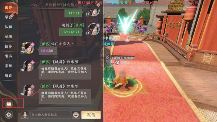 少侠点击聊天窗口,会打开聊天界面,在这里可以查看到世界、帮会、队伍、私聊、招募、喇叭、系统、附近等信息。