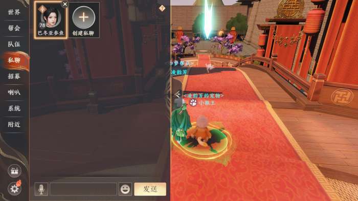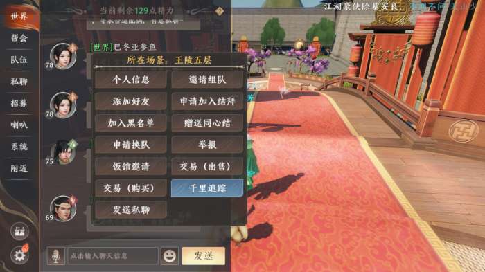 少侠点击其他侠士头像,可以选择【发送私聊】或者其他操作。