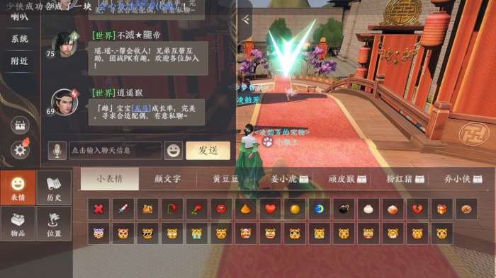 点击【点击输入聊天信息】输入框,可以输入表情、历史、物品、位置、语音等信息,点击【发送】即可发送到对应频道。