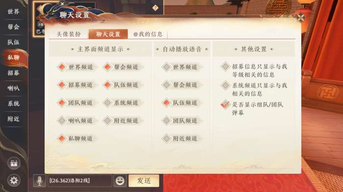聊天设置界面,可以选择关闭/打开需要显示的频道。同时通过附近频道可以与同场景的侠士直接交流,需要等级10级。