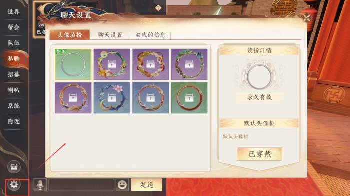 点击聊天左下角-【设置】图标,少侠可以对聊天界面信息进行设置包括头像装扮、聊天设置、和@我的信息。