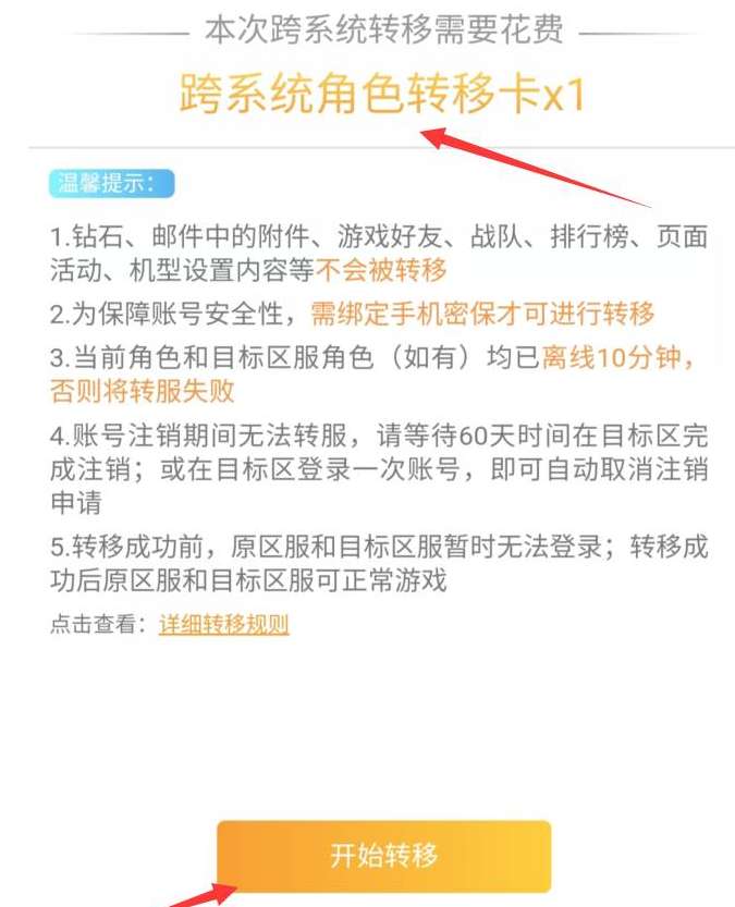 跨系统角色转移注意事项:使用跨系统转移卡转区只能安卓的QQ区转移到苹果【ios】的QQ,微信区也只能是微信转移到微信区。