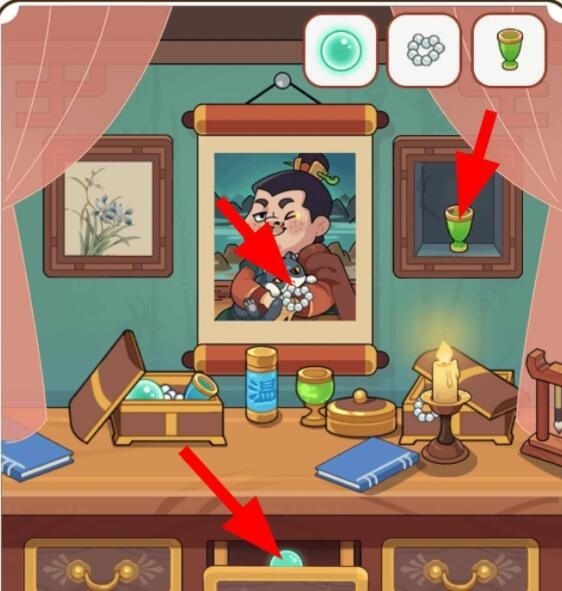 步骤4:点击右边的字画,发现暗格,移动蜡烛到暗格下可以发现里面是丢失的玉杯。接着点击中间画中范统的手,找到丢失的项链。最后拉开中间的抽屉,找到丢失的夜明珠后即可通过。
