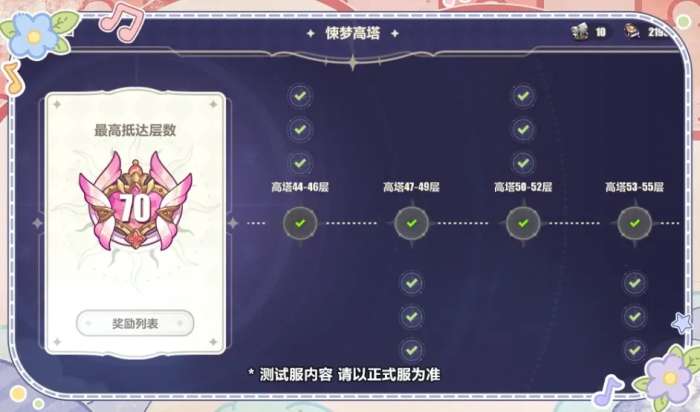 舰长完成「悚梦高塔」中的挑战可获得「《实用魔法》」、「未琢原晶」、商店代币「正位阿卡那」奖励。另外在成功抵达一定层数后,舰长还可以获得能记录最高抵达层数的勋章奖励。
