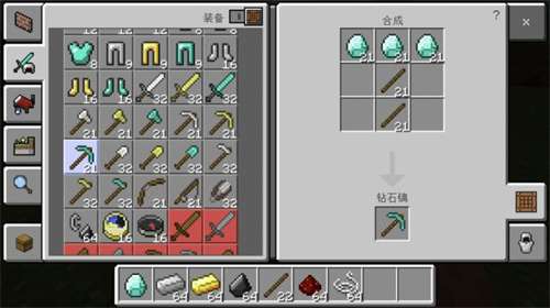 镐Pickaxe——材料:木棍加木板或圆石或铁锭或金锭或钻石