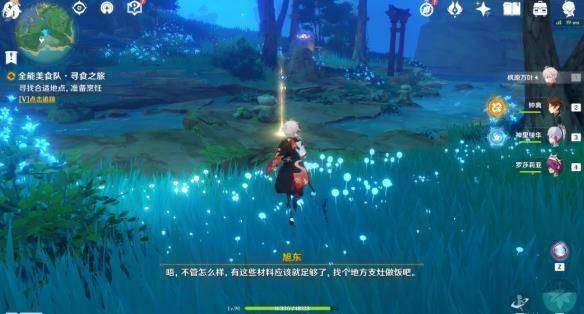 深潜者任务结束后,我们可以在稻妻城中找到全能美食队。他们准备直接去城外北面的树林里采集,然后直接烹饪,但又忌惮那边的魔物,所以提出雇佣我们同行的委托,既然有好吃的,还有报酬,那我们就接下来吧。具体位置如下: