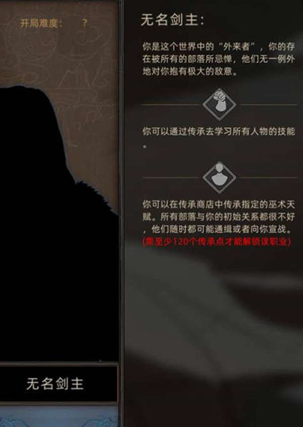 1:无名剑主要求有120传承点才能进行开始游戏的,设定从汉家江湖穿越到这里的无名剑主,拥有汉家江湖中的特性;