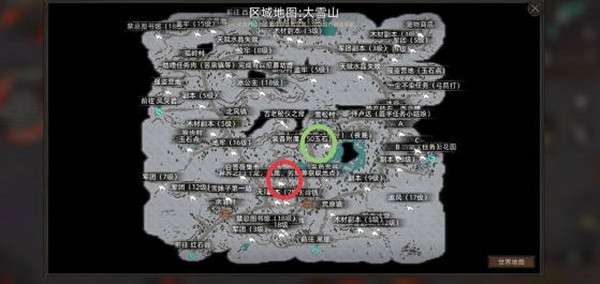 2:大雪山,红色圈圈就是异界之门可以获得龙,凤凰,劣魔等等的兵种,这个是随机获得的,并不是百分百获得的,然后绿色的圈圈就是树人的位置,夜间,青蛇花还有狼牙都在这里。