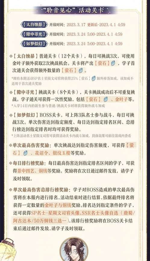 分为普通关卡【太白蚀昴】、挑战关卡【隙中寻光】、BOSS关卡【如梦似幻】3个部分。
