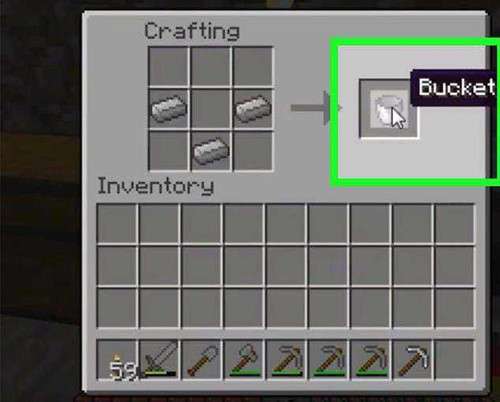 3、准备三块铁锭,放到工作台中合成一个铁桶。