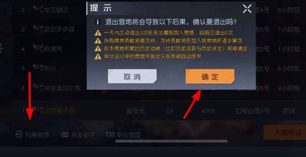6、当我们不是会长之后我们就可以点击左下角的【退出营地】。