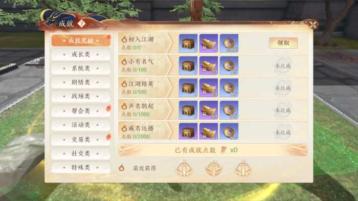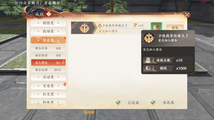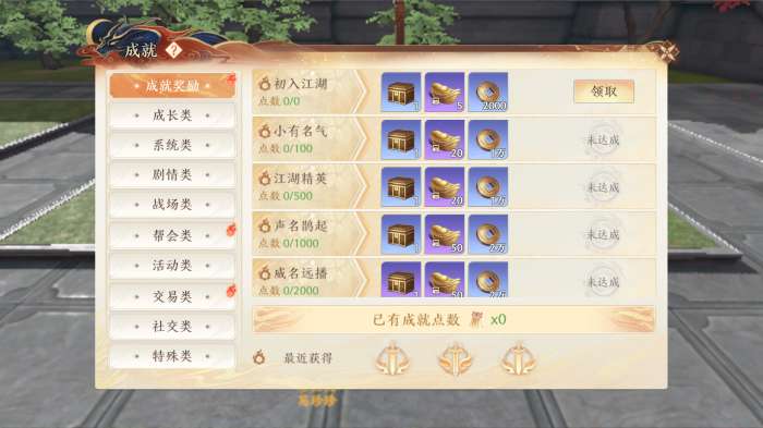 少侠可以通过“菜单-成就”进入成就界面,领取和查看成就。