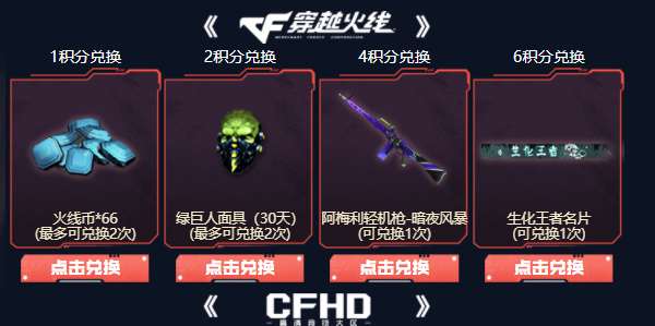 4积分兑换阿梅利轻机枪-暗夜风暴(可兑换一次),6积分兑换生化王者名片(可以兑换一次)。