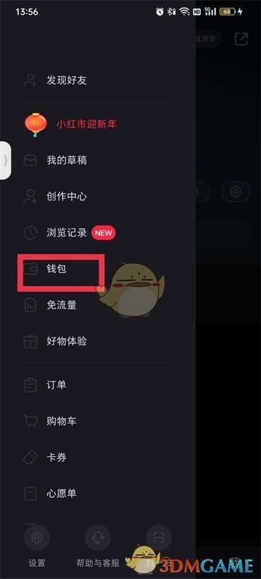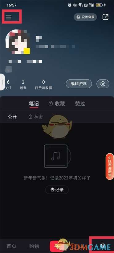 1、打开小红书,点击右下角的【我的】,来到我的页面之后点击左上角的【三横】图标;