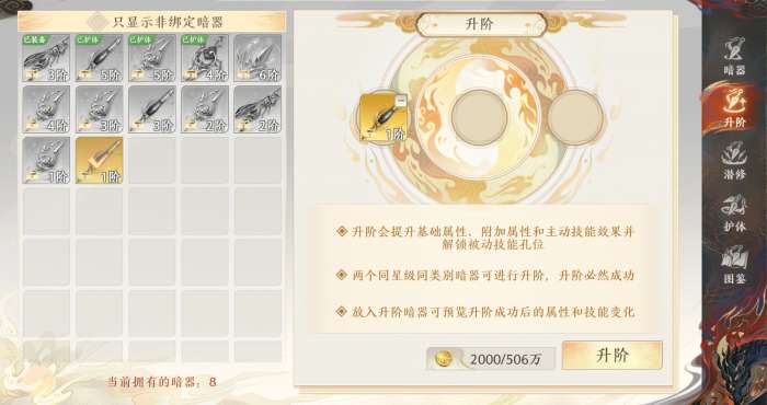 两个同星同类的暗器可以进行升阶,升阶后暗器星级提升1星,最高提升到9星。