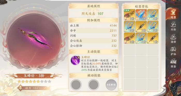 暗器每提高一个星级,暗器的基础属性、附加属性和主动技能效果都会提升并且会解锁被动技能孔位。