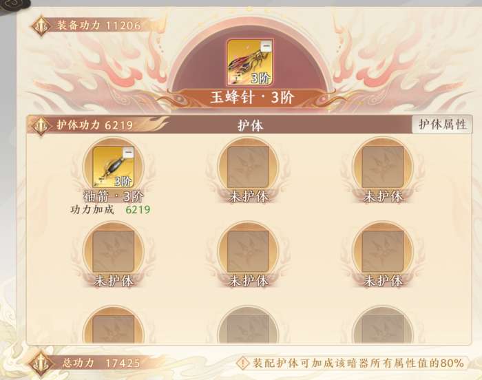 护体后,暗器的基础属性和附加属性按照固定百分比加成给玩家且会有额外功力加成。