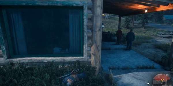 7、然后我们会发现木屋前面有人在谈话,等他们谈完我们赶紧进去。