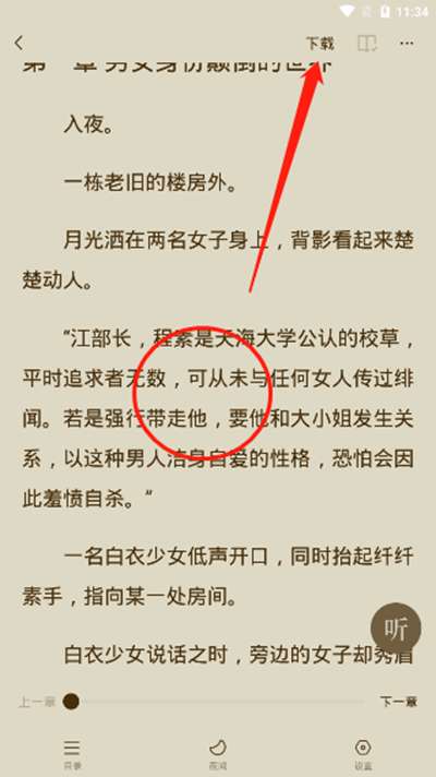 2、进入阅读界面之后我们点击屏幕中间,然后就会出现选项栏,我们点击位于右上角的【下载】。