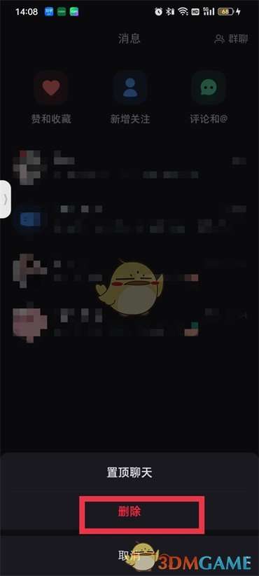 2、来到消息的页面之后长按和好友的聊天框,然后在页面下面会弹几个选项点击【删除】即可。