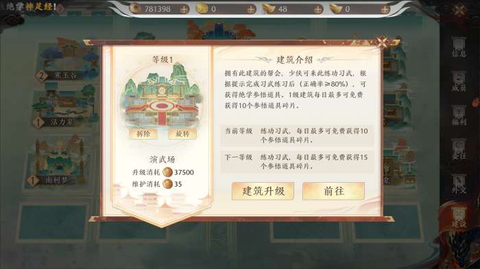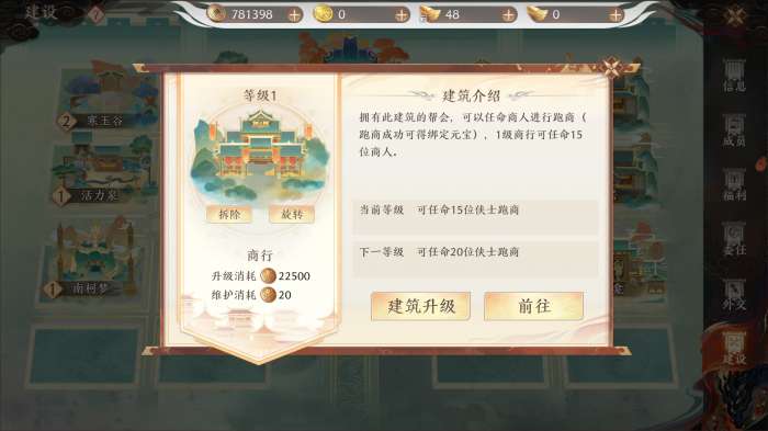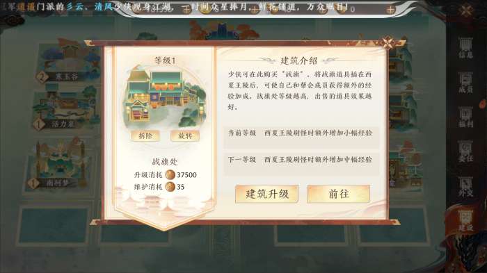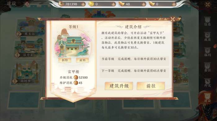 介绍:开启活动“富甲天下”的必要建筑,活动开启后,少侠在西夏王陵刷怪可额外掉落物品,可以免费兑换帮贡,建筑等级提升可以增加兑换帮贡数。