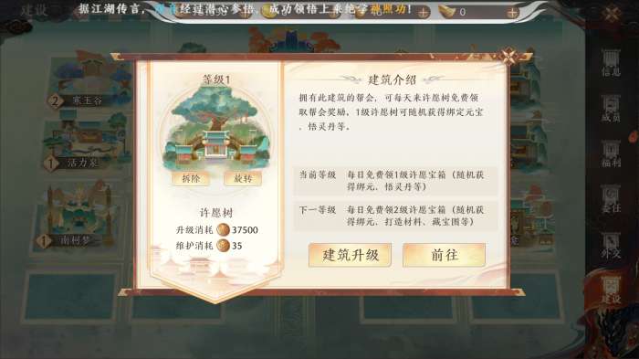 介绍:可每天在许愿树免费领取帮会奖励。1级许愿树可随机获得绑定元宝、悟灵丹等,高等级奖励更丰富。