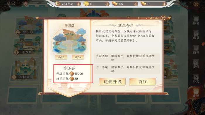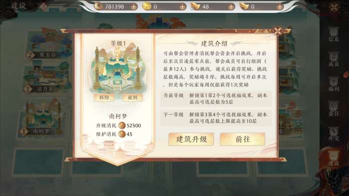 点击建筑,可以查看建筑的详情,建造与升级建筑和日常维护都需要花费不同金额的帮会资金。(可通过成员日常参与帮会活动获得)