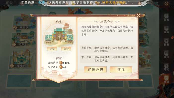 介绍:可以额外获得供奉神龛,领取帮贡机会,随着建筑等级提升获得供奉回报越丰厚。