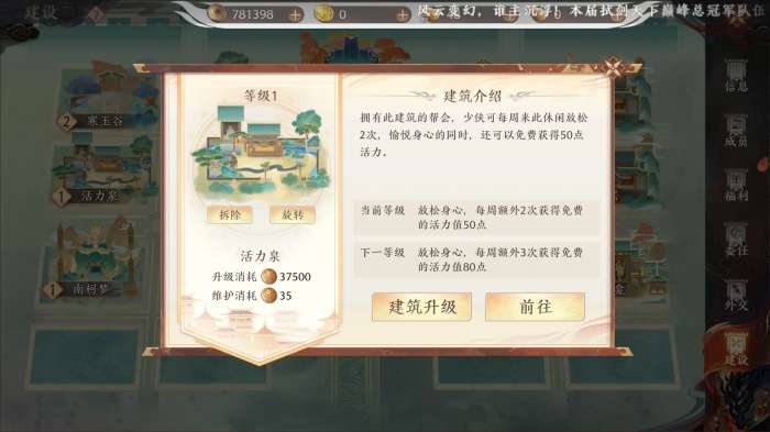 介绍:少侠每周可以免费领取两次活力,随着建筑升级领取次数与领取活力数都会增加。