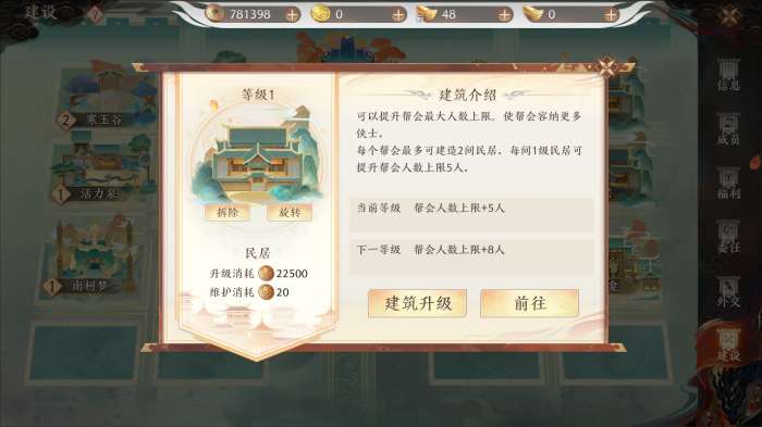 后续升级以及拆除则均可在“帮会-建设”界面完成。