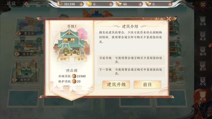 介绍:拥有此建筑开启在珍品阁购物特权,使用帮会通宝即可购买超值道具。