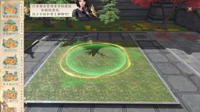 首次建造时,帮会管理者需要在属地中,与“待建造”的牌子进行交互,选择心仪的建筑。