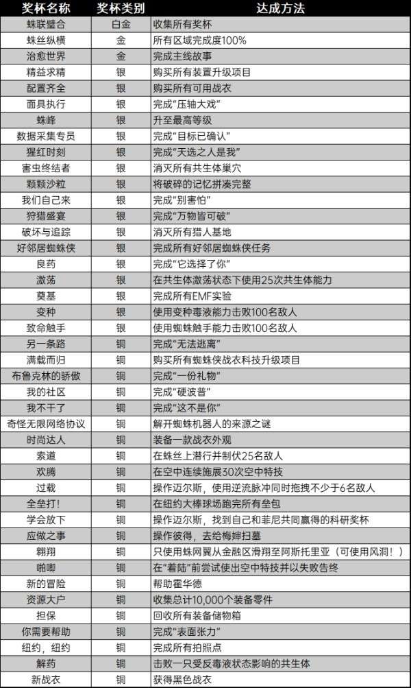 漫威蜘蛛侠2讲述了彼得帕克和迈尔斯莫拉雷斯一起保护纽约市的故事。随着主线和所有支线的完成,游戏里一共有42个奖杯,没有任何难度杯以及多周目杯,整体来说白金难度很低,玩家可以很好的完成。下面小编就为大家带来相关攻略。