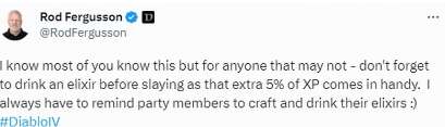 《暗黑破坏神4》第一赛季已上线。近日游戏负责人Rod Fergusson发推文提醒大家,在升级时别忘喝药水,这能让你获得额外的5%经验值。