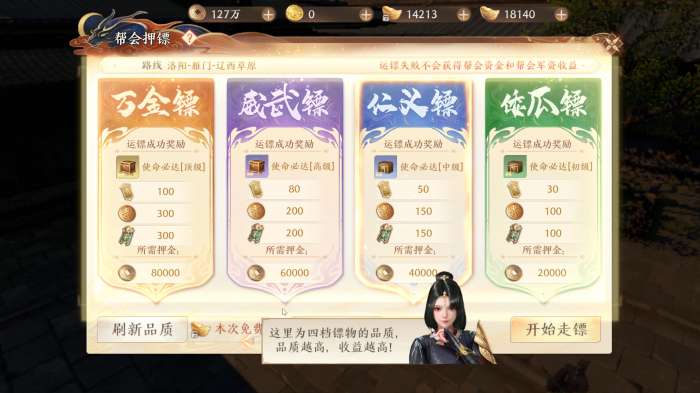 镖车品质有4档:万金镖、威武镖、仁义镖、倭瓜镖,品质随机,万金镖获得奖励最好。