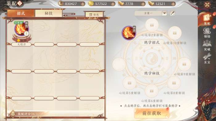 获取的绝学可以在绝学界面装配,绝学槽位需要心境达到一定境界才会解锁。
