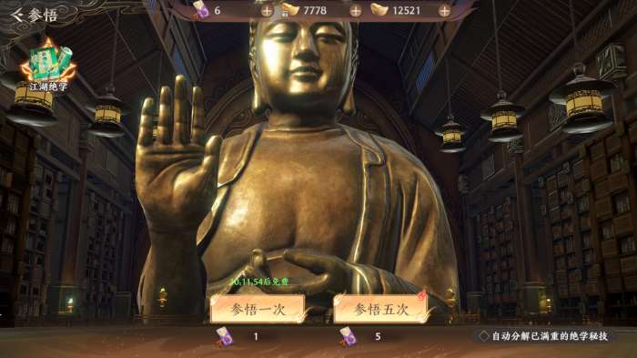 在打开的界面,少侠可以进行【参悟一次】/【参悟五次】,同时可以勾选“自动分解已经满重的绝学秘技”