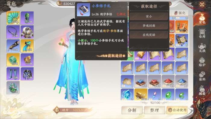 100个小参悟手札,可以合成绝学参悟手札,可以通过【宵小】、【梦魂回廊】、【在线奖励】等方式获得。