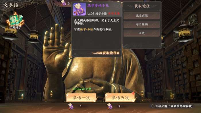 每次参悟,需要消耗【绝学参悟手札】,可以通过元宝商城,每日限购,合成等方式获得。