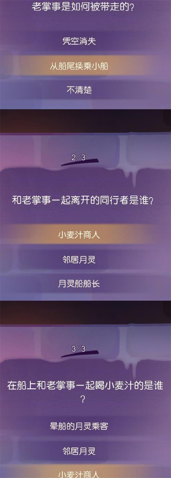 “老掌事是如何被带走的?”正确答案是“被小麦汁商人欺骗”。