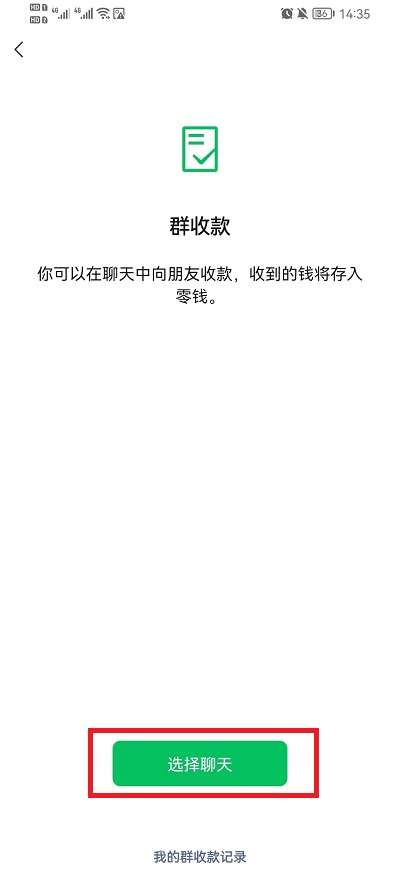 3、随后在收款界面,点击下方的【选择聊天】选择群收款群聊;