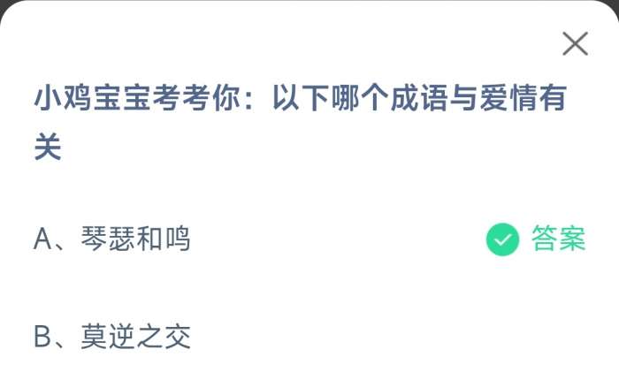 2023支付宝蚂蚁庄园5月20日的题目已经更新了,今天的题目为:以下哪个成语与爱情有关?琴瑟和鸣还是莫逆之交?正确答案是什么,可能很多小伙伴可能还不太清楚。下面小编就为大家带来了正确答案分享,希望能帮助到你。