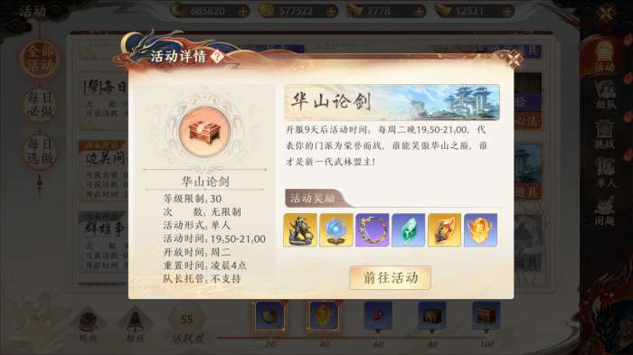 为门派为荣誉而战,谁能笑傲华山之巅,谁才是新一代武林盟主!今天小编给大家带来了《天龙八部2》华山论剑活动攻略分享,每周二晚上19点50分,少侠可以育往洛阳<华山论剑接引使>苏木明处,进入休息室等待华山论剑开启。少侠可以点击【活动】-【华山论剑】-【前往活动】快速前往苏木明处进行参与玩法。