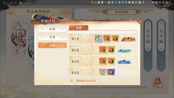 ◇ 复赛:淘汰赛制,进入复赛的少侠将同职业进行两两匹配,胜利者晋级,失败者淘汰,最终每个职业第一名的获胜者将晋级决赛。