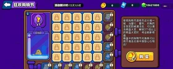 玩家通过完成任务获得购物节游戏币,使用游戏币摇一摇,点亮棋盘中的格子,获得格子中奖励
