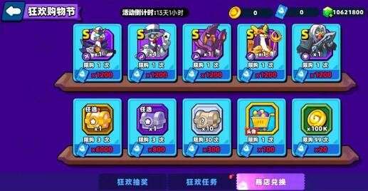 活动期间可在狂欢礼包中购买购物节游戏币、装备箱等超高返利礼包!